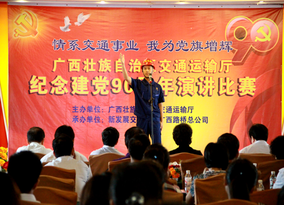 6月10日上午,由集團(tuán)公司承辦的全區(qū)交通運(yùn)輸系統(tǒng)慶祝建黨90周年“情系交通事業(yè),我為黨旗增輝”演講比賽在南寧舉行。自治區(qū)交通運(yùn)輸廳副廳長(zhǎng)梁毅、副巡視員黃小幸、廳長(zhǎng)助理劉昕等領(lǐng)導(dǎo),廳直屬單位的領(lǐng)導(dǎo)及觀眾共350人到現(xiàn)場(chǎng)觀看比賽。自治區(qū)直屬企事業(yè)工會(huì)副主任陳元滾、自治區(qū)直屬機(jī)關(guān)工委組織部部長(zhǎng)李祖循等領(lǐng)導(dǎo)應(yīng)邀參加。來(lái)自廳直屬單位共23位選手參加了此次比賽。