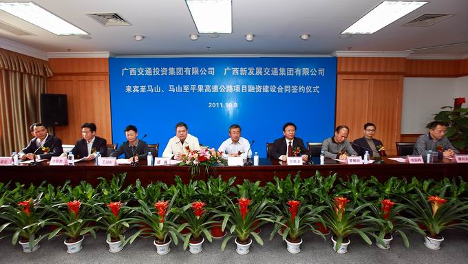 10月8日,集團(tuán)公司和廣西交通投資集團(tuán)公司來(lái)賓至馬山、馬山至平果高速公路項(xiàng)目融資建設(shè)合同簽約儀式在南寧舉行。自治區(qū)交通運(yùn)輸廳廳長(zhǎng)潘巍、總工程師王劼耘;集團(tuán)公司董事長(zhǎng)、黨委書記朱堅(jiān)和,總經(jīng)理李定倫,黨委副書記、紀(jì)委書記張友坐,副總經(jīng)理劉明洪,總會(huì)計(jì)師鄧遠(yuǎn)志,總工程師覃炳賢;交投集團(tuán)副董事長(zhǎng)、總經(jīng)理、黨委副書記劉可,黨委副書記、紀(jì)委書記羅斯卡,副總經(jīng)理韋昌鴻、廉向東,及雙方有關(guān)部門、直屬各單位負(fù)責(zé)人參加了簽約儀式。