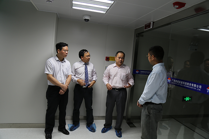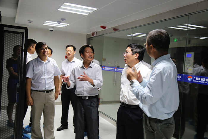 簽約儀式結(jié)束后,與會的各位領(lǐng)導(dǎo)共同參觀了我集團(tuán)公司控股企業(yè)——廣西捷通公司ETC中心機(jī)房,并聽取了技術(shù)人員對中心系統(tǒng)建設(shè)情況、設(shè)備安裝使用情況、機(jī)房運轉(zhuǎn)流程、技術(shù)支持、監(jiān)控及操作、消防通道等情況的匯報。