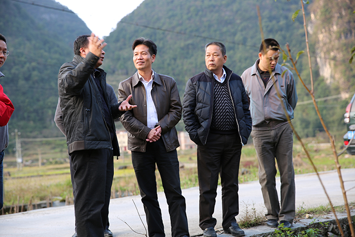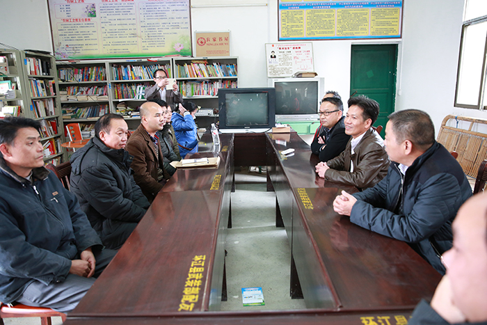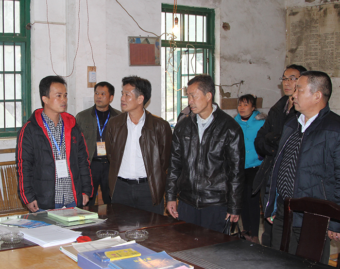 集團公司朱堅和董事長(左三)、張友坐副書記(右一)聽取駐村”第一書記“梁義寬匯報工作。 在相堯村、豹山村、才帛村,朱堅和董事長分別與當(dāng)?shù)劓?zhèn)、村干部以及覃獻康、梁義寬、蔣博三位派駐農(nóng)村“第一書記”和扶貧工作隊隊員進行親切交談,詳細詢問“第一書記”工作、生活情況,并聽取了“第一書記”關(guān)于幫扶村的黨建及村集體經(jīng)濟發(fā)展情況匯報。得知目前各駐村書記及扶貧工作隊員已經(jīng)完成精準扶貧入戶摸底調(diào)查時,朱堅和董事長對“第一書記”到村以來,深入調(diào)查走訪,積極幫助村里理思路、定規(guī)劃、辦實事,表示充分肯定。
