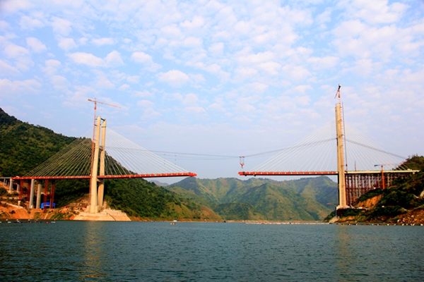 紅水河特大橋是由集團直屬企業廣西路橋工程集團有限公司承建的一座雙塔雙索面混合式疊合梁斜拉橋,橋跨布置(213+508+185)米,主塔高