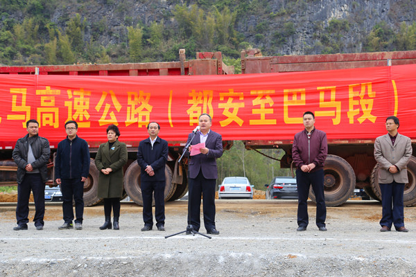 集團(tuán)公司副董事長、總經(jīng)理、黨委副書記唐咸秋在會(huì)上發(fā)表講話,他表示本項(xiàng)目的建設(shè),將極大改善我區(qū)尤其是河池等地的交通狀況和投資環(huán)境,為確保我區(qū)打贏脫貧攻堅(jiān)戰(zhàn)的勝利,具有十分重要的意義。他表態(tài)集團(tuán)公司將充分發(fā)揮人才優(yōu)勢(shì)、技術(shù)優(yōu)勢(shì)和全產(chǎn)業(yè)鏈優(yōu)勢(shì),安全、優(yōu)質(zhì)、高效、廉潔地建好項(xiàng)目,為營造“三大生態(tài)”、實(shí)現(xiàn)“兩個(gè)建成”、譜寫建黨百年廣西發(fā)展新篇章作出新的更大的貢獻(xiàn)。河池市黃光華書記表示,賀巴高速是脫貧致富之路、是共建共贏之路、是圓夢(mèng)小康之路,他要求河池市各級(jí)黨委、政府要高度重視,沿線群眾要積極配合高速公路的建設(shè)。