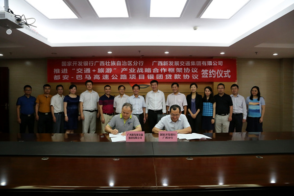 6月9日,集團公司與國家開發(fā)銀行廣西分行在南寧簽訂戰(zhàn)略合作框架協(xié)議。集團公司黨委書記、董事長朱堅和,黨委副書記、副董事長、總經(jīng)理唐咸秋,黨委委員、總會計師鄧遠志,國家開發(fā)銀行廣西分行黨委書記、行長謝志軍,副行長呂軍等領(lǐng)導出席簽約儀式。簽約前,雙方進行了友好會談,雙方重點圍繞賀州至巴馬高速公路、融水至河池高速公路、國省干線公路及沿線地區(qū)的“交通+旅游”項目開展深度戰(zhàn)略合作等方面進行了深入的交流與探討,并達成了一致共識。座談會后,唐咸秋與呂軍分別代表雙方簽訂戰(zhàn)略合作框架協(xié)議。雙方有關(guān)部門負責人參加簽約儀式。(集團公司 投資改革發(fā)展部)