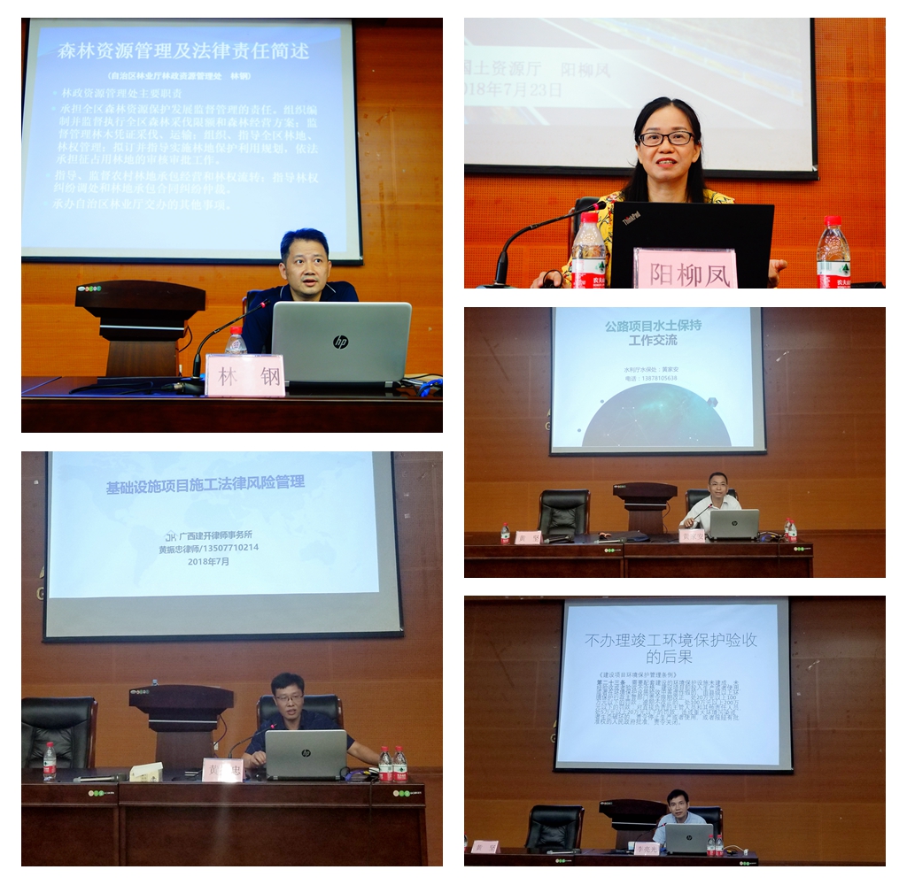 此次培訓邀請了自治區國土資源廳規劃處副處長陽柳鳳、林業廳林政處副處長林鋼、環境保護廳環評處處長李亮光、水利廳水土保持處副處長黃家安以及廣西建開律師事務所主任黃振忠律師5位專家圍繞項目建設過程中的國土、林地、環境保護、水土保持以及項目經營常見法律政策問題進行專題授課。此次培訓緊貼建設項目管理的實際需求,內容豐富,針對性強。通過培訓,提高了廣大建設項目管理人員的法律政策水平,增強了處理具體法律問題的能力,對今后依法依規建設項目起到很好的促進作用。